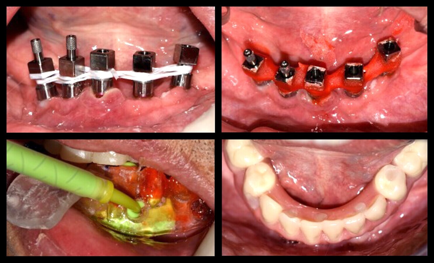 El presente artículo muestra el caso de un paciente de sexo masculino de 82 años de edad que acude a consulta para una rehabilitación integral. En la evaluación clínica se le diagnostica enfermedad periodontal en el maxilar superior, en la anamnesis el paciente hace referencia de haber perdido las piezas inferiores por enfermedad periodontal, a nivel sistémico refiere padecer de diabetes por más de quince años; asma desde que era niño y utilizar inhaladores de corticoides tres veces al día; fue diagnosticado con cáncer de próstata diez años antes y recibió tratamiento quirúrgico acompañado de orquiectomía, hormonoterapia y radioterapia, a la fecha fue dado de alta; también hace referencia a haber sido diagnosticado con enfermedad de la glándula tiroides y recibe tratamiento con hormonas de suplemento; finalmente, indica sufrir de gastritis crónica hace más de quince años y consume antiácidos de manera diaria desde entonces. El paciente pasa por un tratamiento periodontal para el maxilar superior y se procede a realizar la evaluación del reborde mandibular para la colocación de los implantes dentales en la mandíbula con la posterior rehabilitación con una prótesis fija híbrida.
