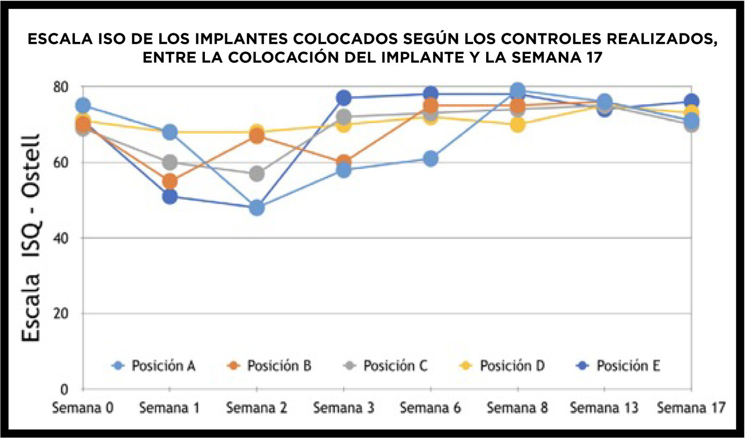 Figura 9. Análisis de la estabilidad secundaria, específicamente de la curva de la oseointegración, donde se observa que el pico más bajo se produce entre la 2da y 3ra semana para luego incrementar la estabilidad y lograr valores rehabilitables mayores a 70 ISQ en la semana 8 (dos meses). Posterior a esto, la mineralización ósea se mantiene constante en el tiempo.