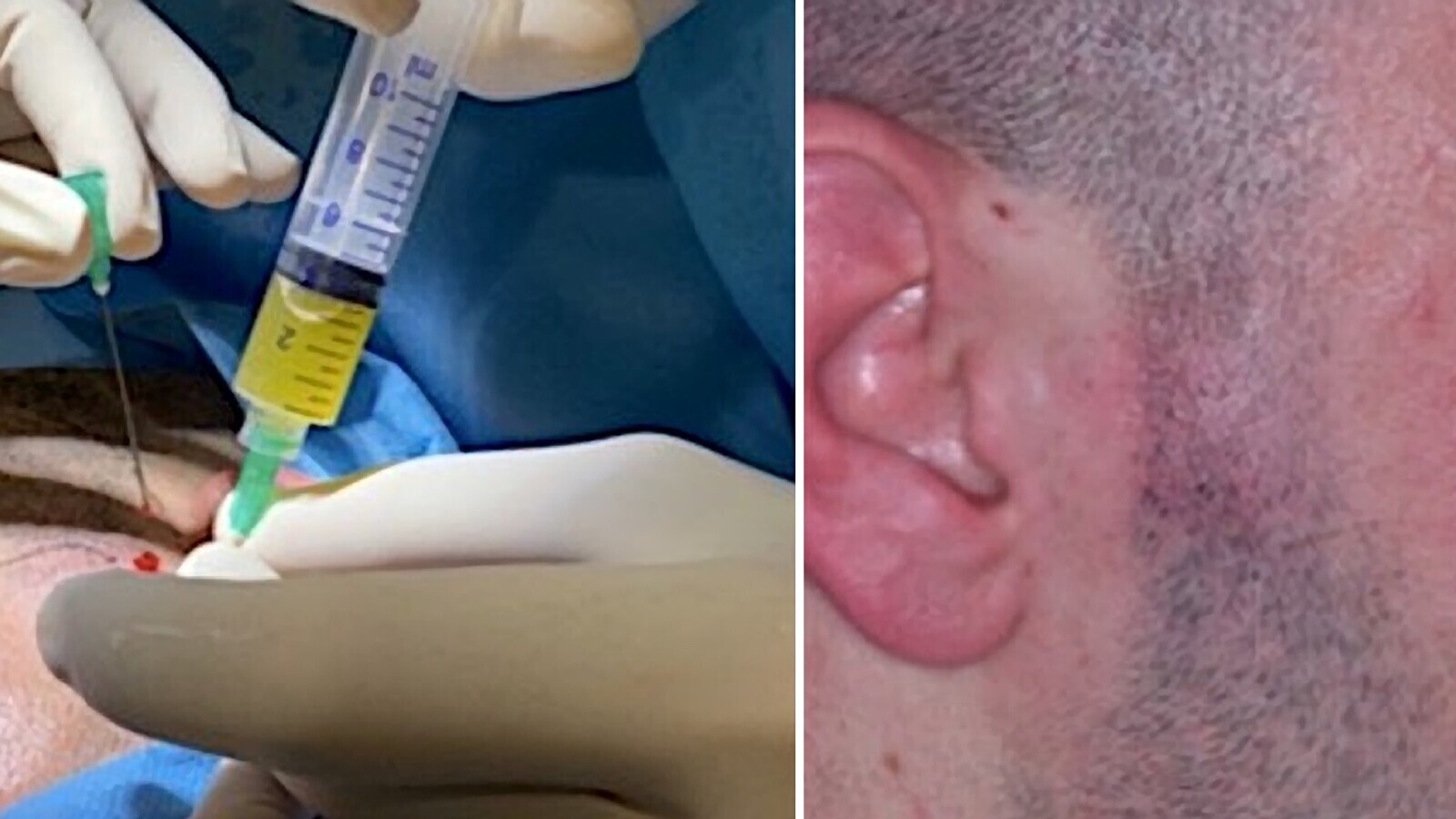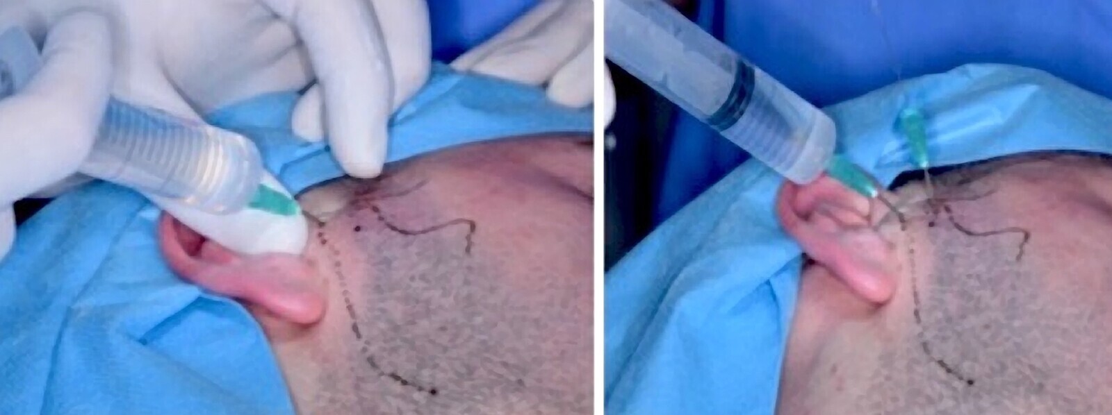 Figs. 5a-5b. Infiltración de 2 ml de PRP del compartimento superior de la articulación temporomandibular derecha. Postoperatorio inmediato donde se observa enrojecimiento y tumefacción de la zona preauricular.