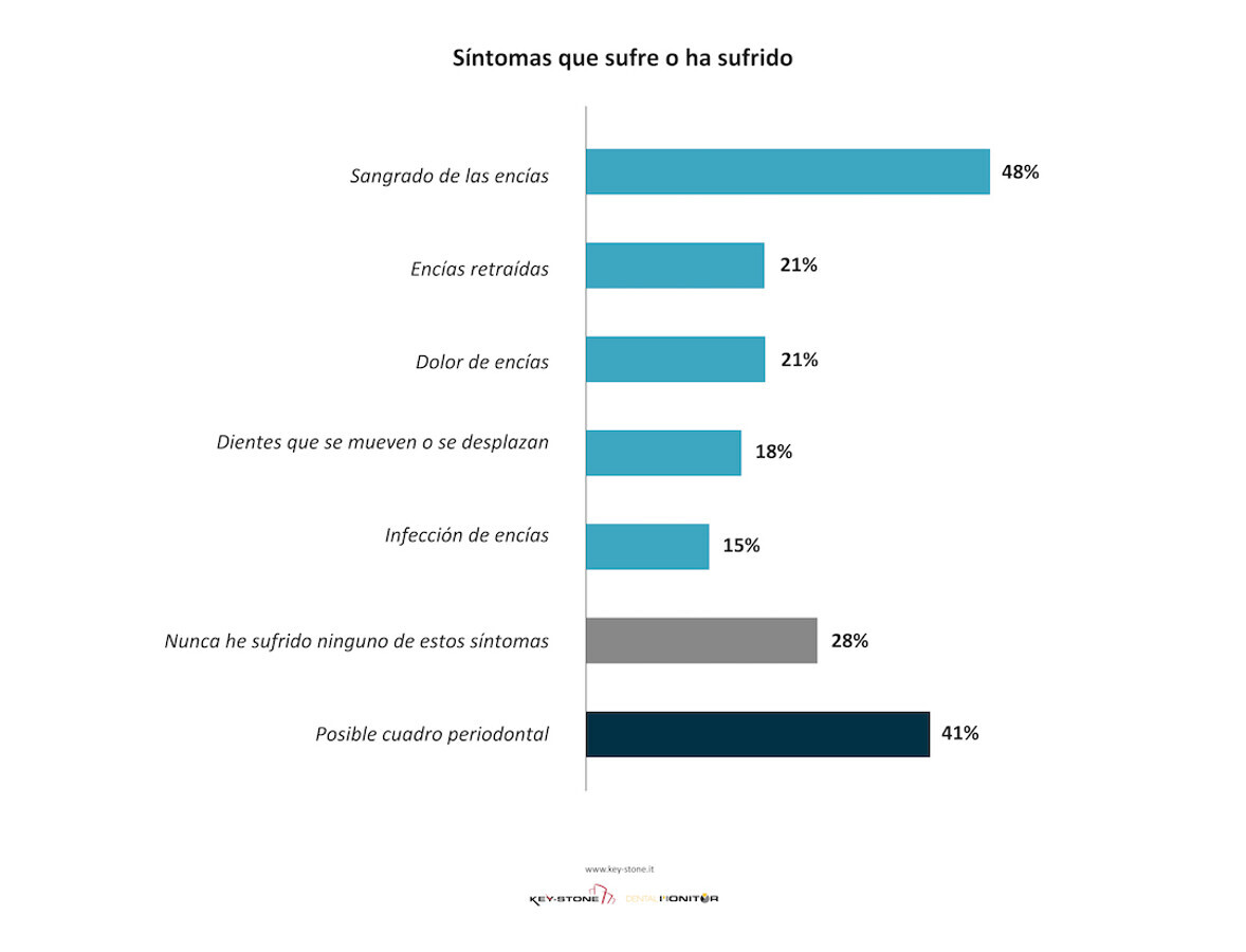 De la población total encuestada (con edades de 35 a 74 años), hasta un 28% declara no presentar ninguno de los síntomas que podrían relacionarse con una periodontitis. Sin embargo, este porcentaje disminuye progresivamente y en función de la edad, situándose en el 15% para los mayores de 60 años (un 85% de los entrevistados presenta, al menos, alguno de estos síntomas). La única diferencia estadísticamente significativa entre los países se encuentra en la presencia o no de "recesión gingival" (se trata de una percepción y no necesariamente de un diagnóstico): en España es señalada por el 21% de los encuestados, mientras esta tasa asciende al 31% en la muestra europea.