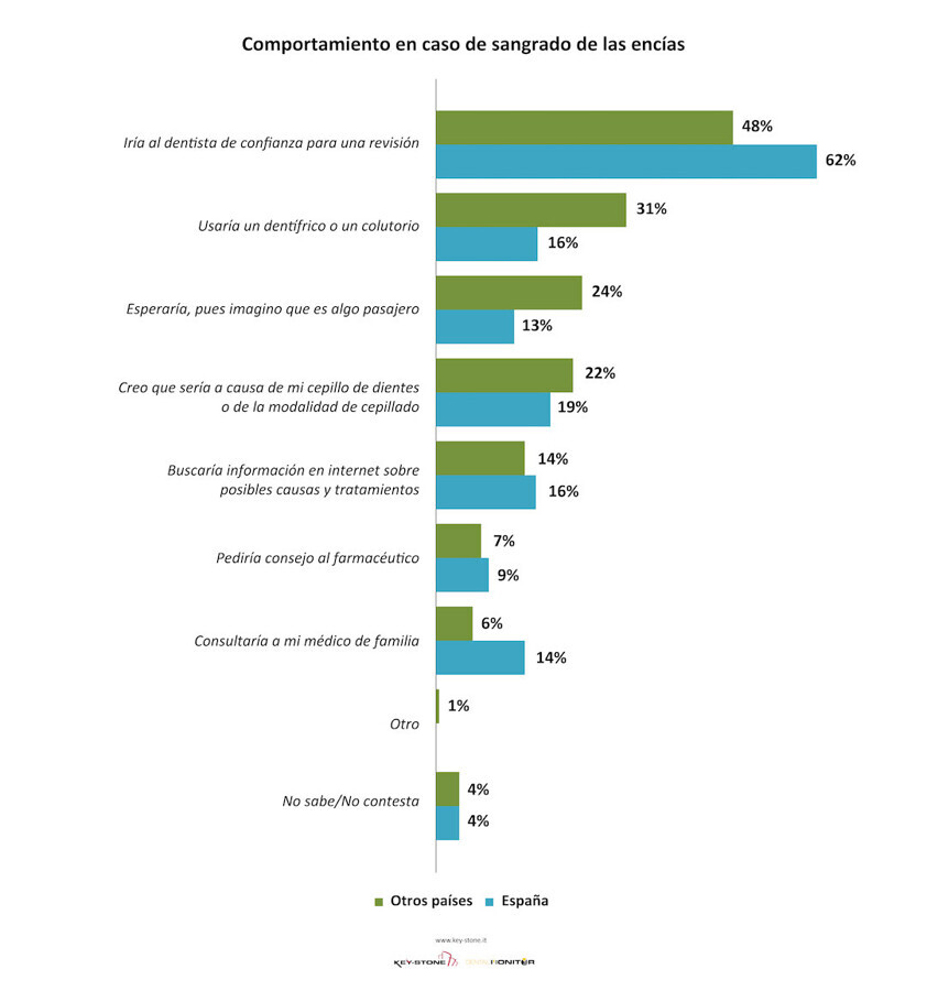 A pesar de que casi la mitad de la población española asegura desconocer la periodontitis (sus síntomas iniciales, los más graves, las consecuencias, las complicaciones asociadas, cómo prevenirla o tratarla), la actitud mayoritaria de los entrevistados en España es que, ante cualquier alteración en su salud bucal (como el sangrado de encías que, aunque no se atribuya a la periodontitis, suele estar muy relacionado con la enfermedad), normalmente se opta por visitar al dentista.