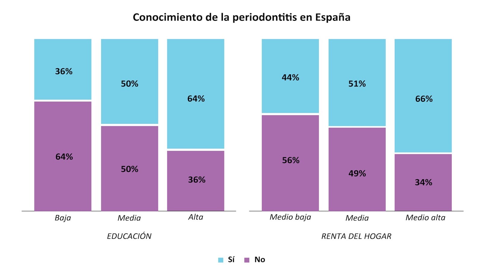En España, se aprecia una enorme diferencia en cuanto a los conocimientos sobre la periodontitis en función, sobre todo, del nivel de estudios y de los ingresos del hogar de los encuestados. A pesar de que estos dos parámetros están fuertemente correlacionados entre sí, la formación escolar prevalece sobre la renta.