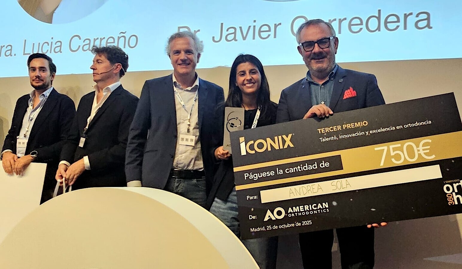 Tras la coincidente resolución del jurado, y la votación del público, el primer premio ICONIX dotado de 2500 euros fue para Lucía Carreño de la Universidad Complutense de Madrid (“Camino hacia una medicina personalizada: el papel de la genética en el tratamiento preventivo de la Maloclusión esquelética de Clase III”); el segundo premio, con una dotación de 1.500 euros, fur para Javier Corredera, de la Universidad de Sevilla (“Análisis de la inclinación del incisivo superior antes del tratamiento ortopédico de la Clase II con anclaje dental/esquelético”), y el tercero, con 750 euros, para Andrea Sola, del Master de Ortodoncia de la Universidad de Valencia (“Análisis tridimensional de la Posición Esperada de la Raíz (ERP) post-tratamiento en el movimiento dentario ortodóncico (MDO) sin CBCT. Revisión sistemática”).