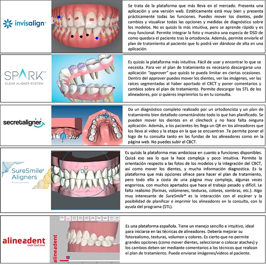 En resumen, podemos decir que las diferencias entre compañías se van acortando, pero el fotorealismo y la presentación del clincheck así como la posibilidad de que el clínico pueda mover directamente los dientes y colocar los ataches, unido a la integración automática del CBCT y/o los registros fotográficos y el DSD (diseño digital de la sonrisa) marcan grandes diferencias que no se ven reflejadas en el precio. Hay veces que excelentes plataformas, como Suresmile, que permiten la integración del CBCT y hasta el cementado indirecto digital de brackets y aditamentos, pierden parte de su atractivo por la complejidad de su manejo, si bien esto deja de ser un problema cuando uno se habitúa a ella, tras una curva de aprendizaje prolongada.